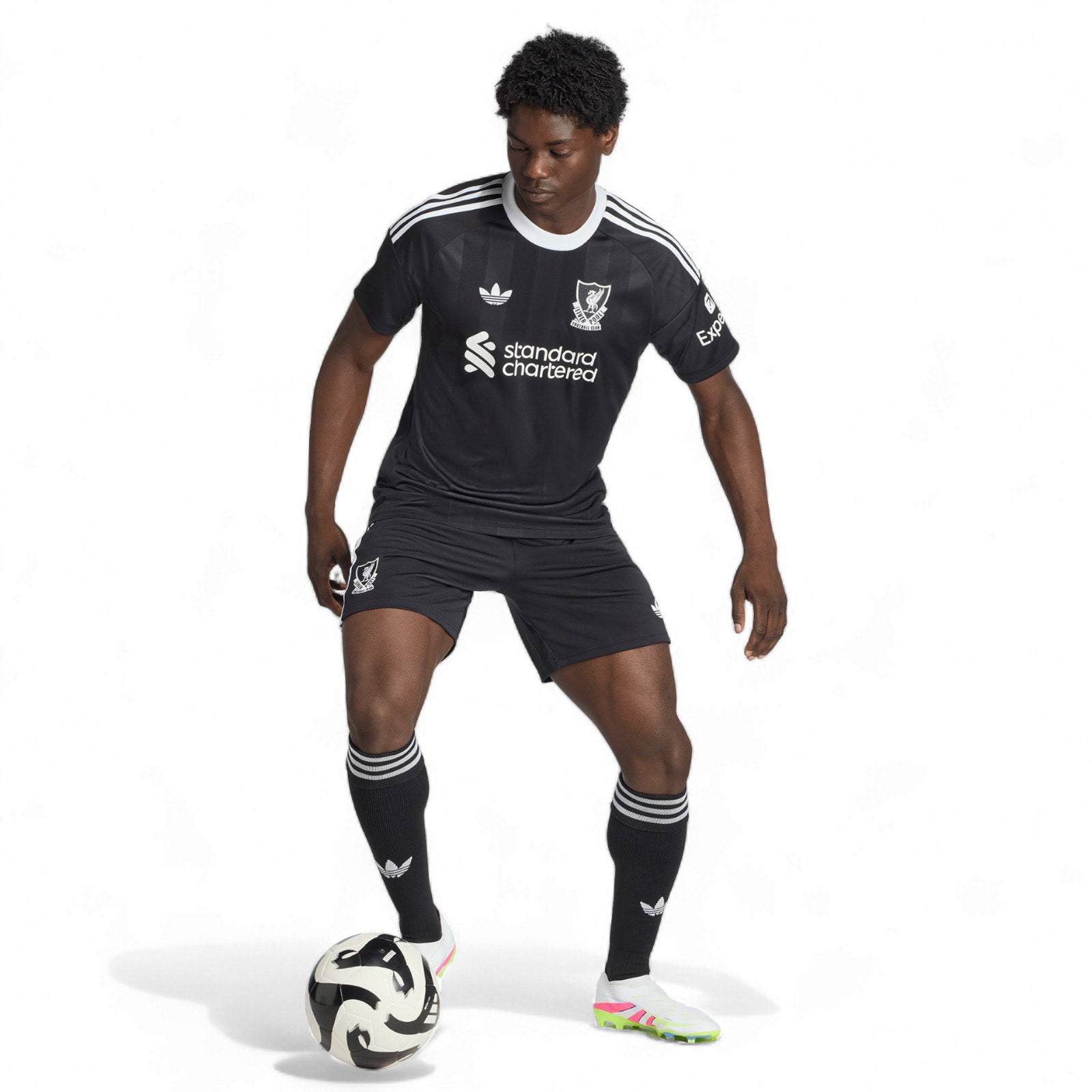 Created to keep clean sheets on the road, this Liverpool FC Goalkeeper Jersey shares its Trefoil and vintage club crest with the club's third kit outfield shirts. Clad in imposing black colours, it's designed to stretch with your every movement for first-class keeping. Behind the scenes, AEROREADY manages moisture to keep you focused on every football threat.