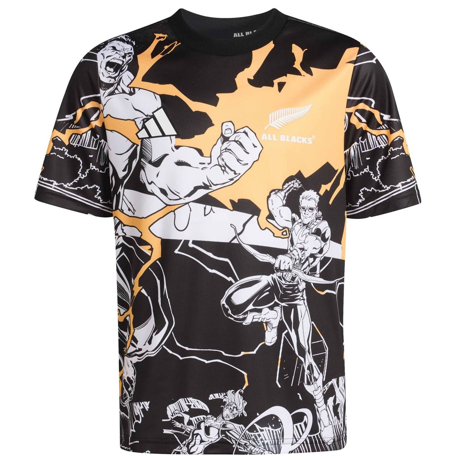 Built for the best. Watch your young New Zealand rugby union fan represent their heroes in this All Blacks Marvel Captains Run Jersey. A symbol of unity, it displays a bold design depicting the All Blacks battling alongside the Marvel Avengers on the pitch. Created for the ‘Captain's Run’, the final training session before a game, this shirt is all about overcoming challenges. Feel comfortable. Designed to manage the body's sweat, adidas AEROREADY keeps them feeling comfortable longer. The interlock fabric, meanwhile, offers durability and a soft feel against the skin. Whether they’re taking their first steps in the game or watching from the sidelines, they’ll feel part of the action in an eye-catching adidas jersey that’s ready to inspire the next generation of rugby stars.