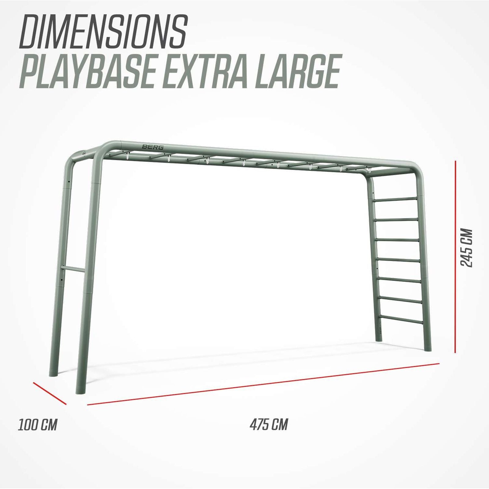 The BERG PlayBase Climbing Frame – Extra Large measures 475cm wide, 100cm deep, and 245cm high, featuring a durable steel frame with 8 horizontal bars designed for versatile play and exercise. The PlayBase combines lasting strength with practical design. Its broad frame anchors securely into the ground with no need for concrete, ensuring stability and a clean finish. Installation is straightforward and can be completed with just a shovel and a spirit level. Suitable for users aged 3 years and over.