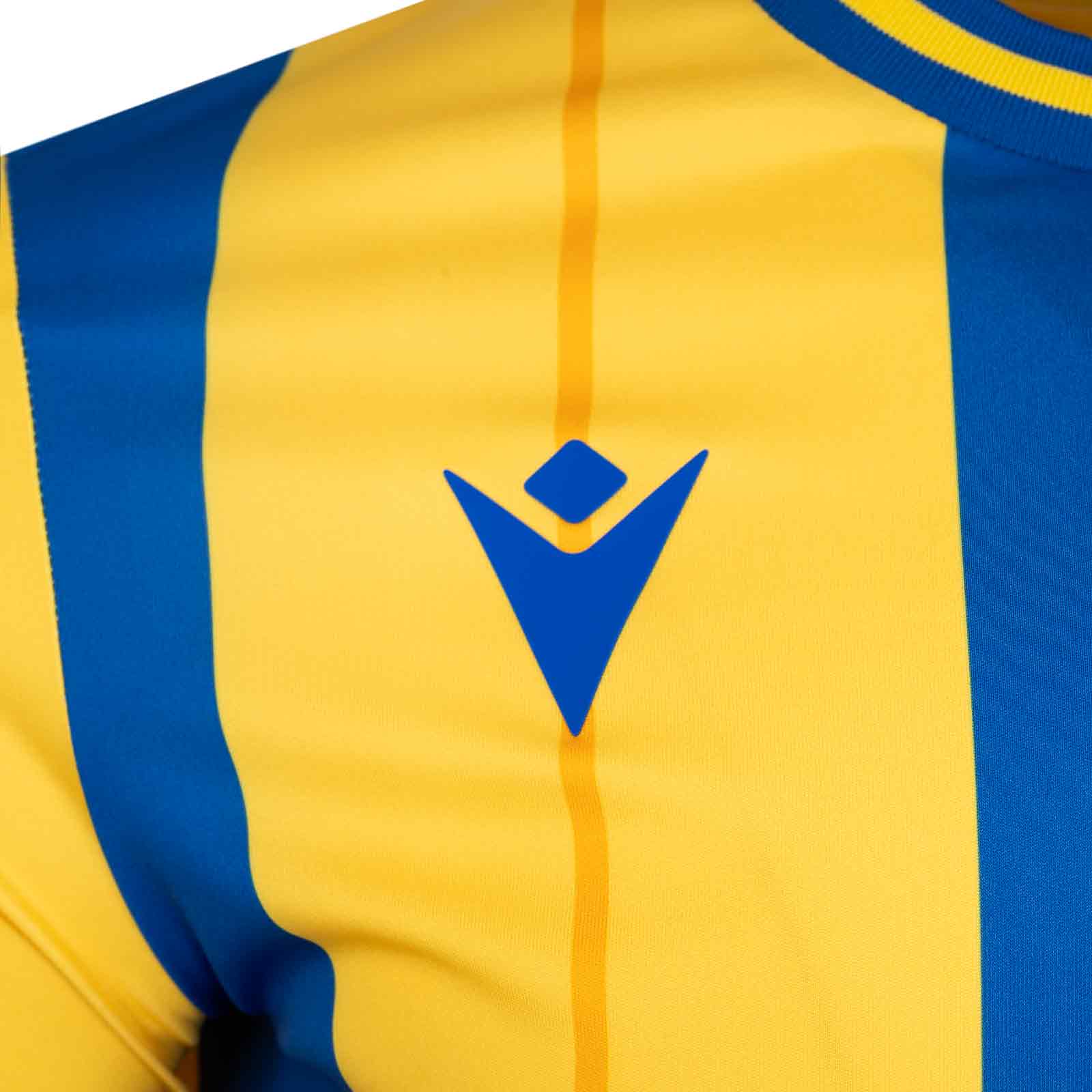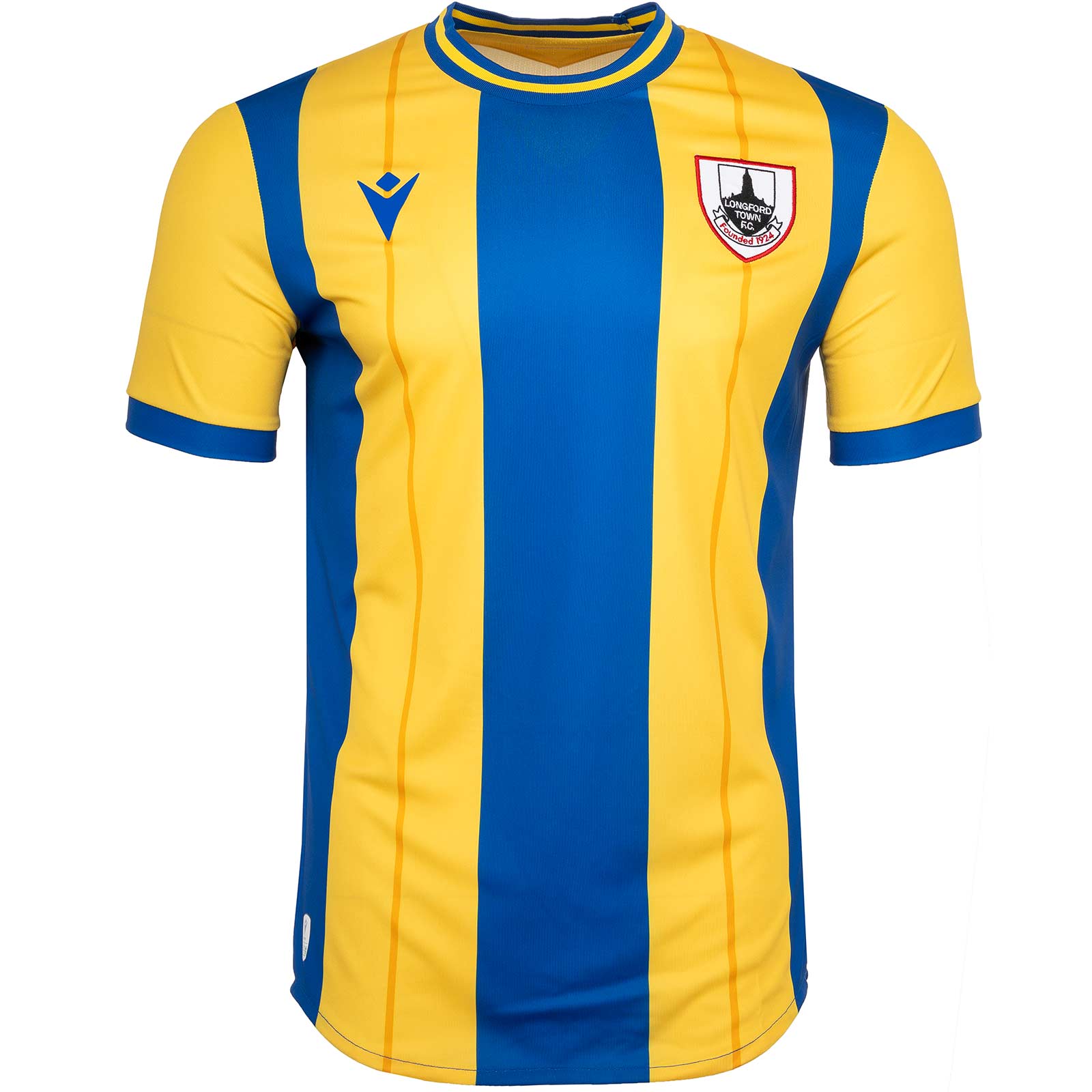 Get match-day ready with the official Macron Longford Town FC 2025/26 Away Jersey. Featuring a bold yellow and blue striped design, this eye-catching jersey proudly displays the Macron logo on the right of the chest and the Longford Town FC crest on the left, showcasing team pride in every detail. The short sleeves and ribbed round neck provide a comfortable fit, ideal for both cheering in the stands and playing on the pitch. Wear the colours with pride.