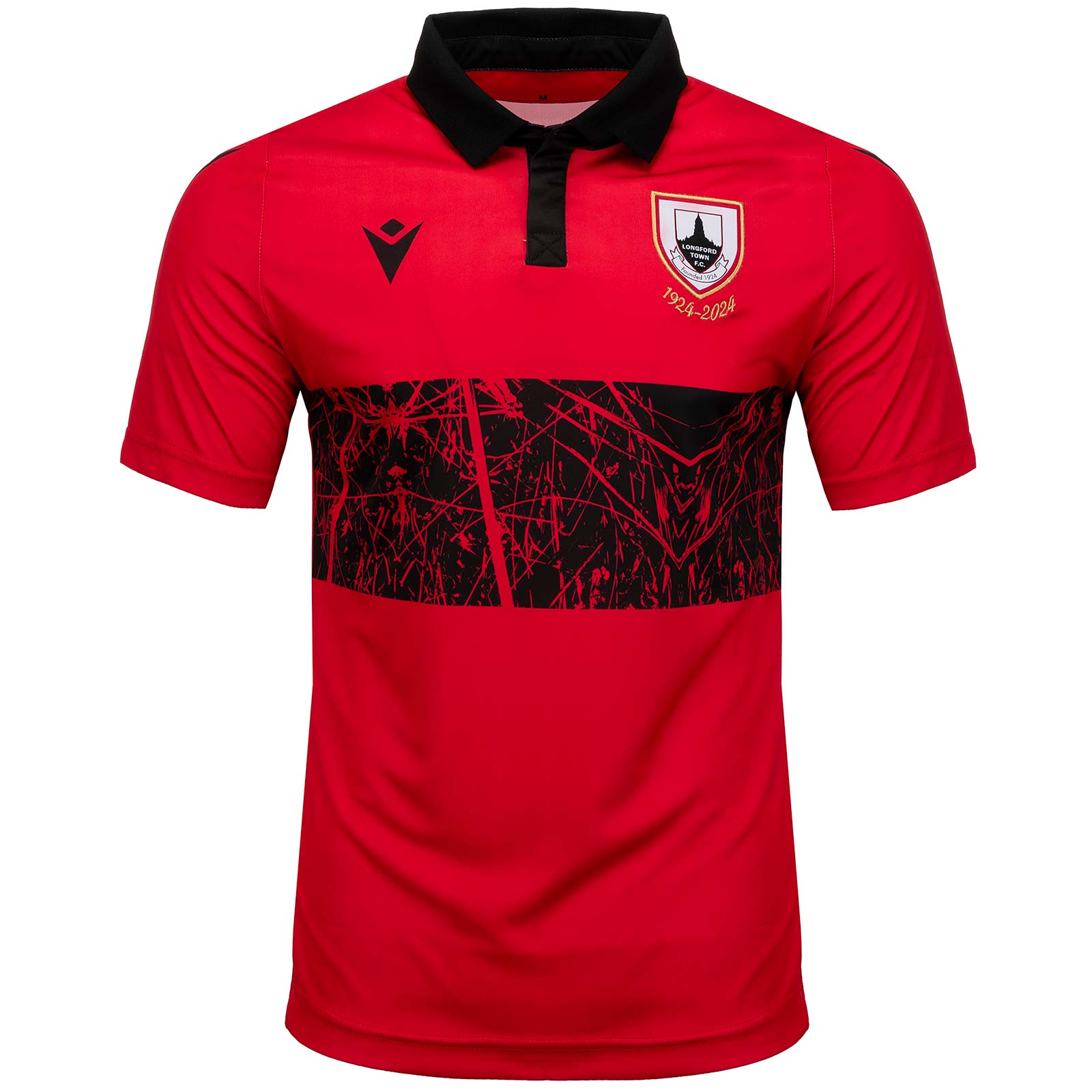 Longford Town Football Club, who celebrate their centenary in 2024. The Macron Longford Town 24 Kids Home Jersey red in colour with a stylised black stripe across the trunk nods to designs of the Irish side’s beginnings to mark their 100 years of existence. Made of sweat-wicking fabric and featuring a foldover collar with a button placket, it's finished with the Longford Town Club crest on the left chest.