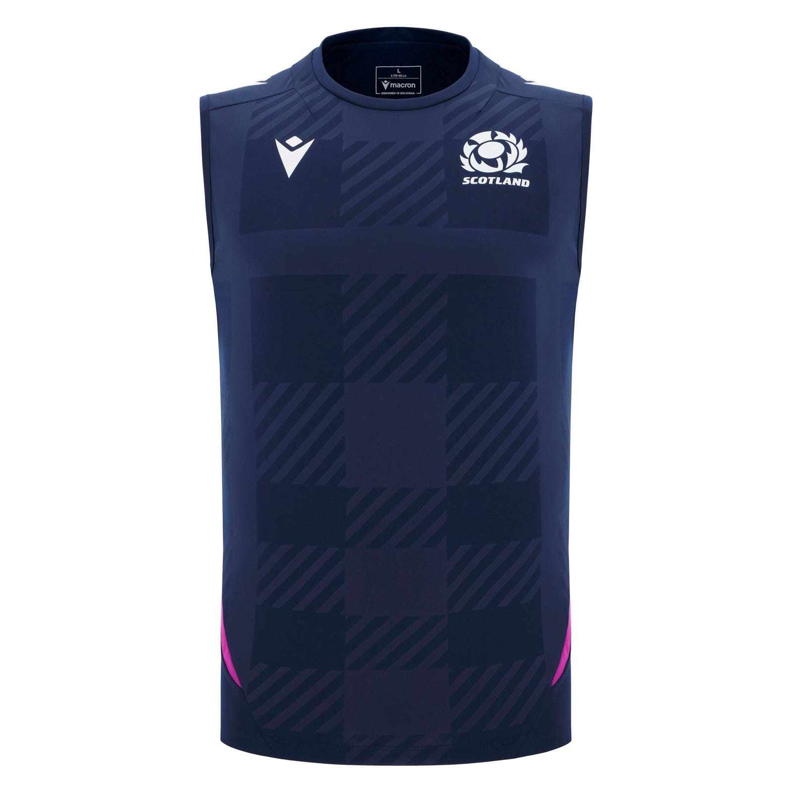 The Macron Scotland Rugby 2025/26 Training Vest is built for performance, featuring a lightweight, sleeveless design ideal for warm-weather training. Its navy base is enhanced with subtle tonal patterns, while the official Scotland crest and Macron logo provide an authentic team finish. Comfortable, breathable, and designed for unrestricted movement - perfect for gym sessions or on-field practice.