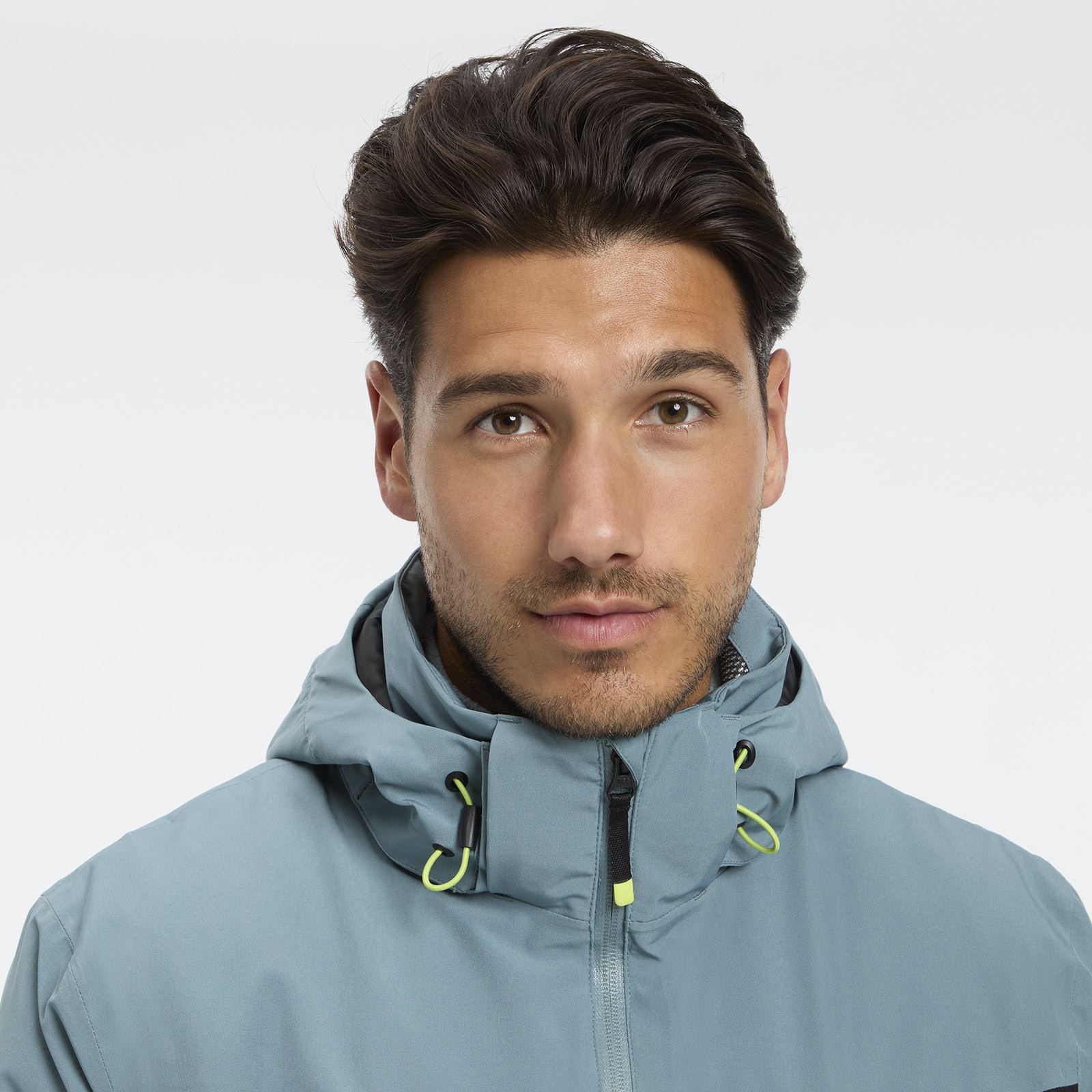 - Higher stand-up collar with chin guard, zip-off adjustable hood, and adjustable cuffs with inner thumbhole cuffs for comfort