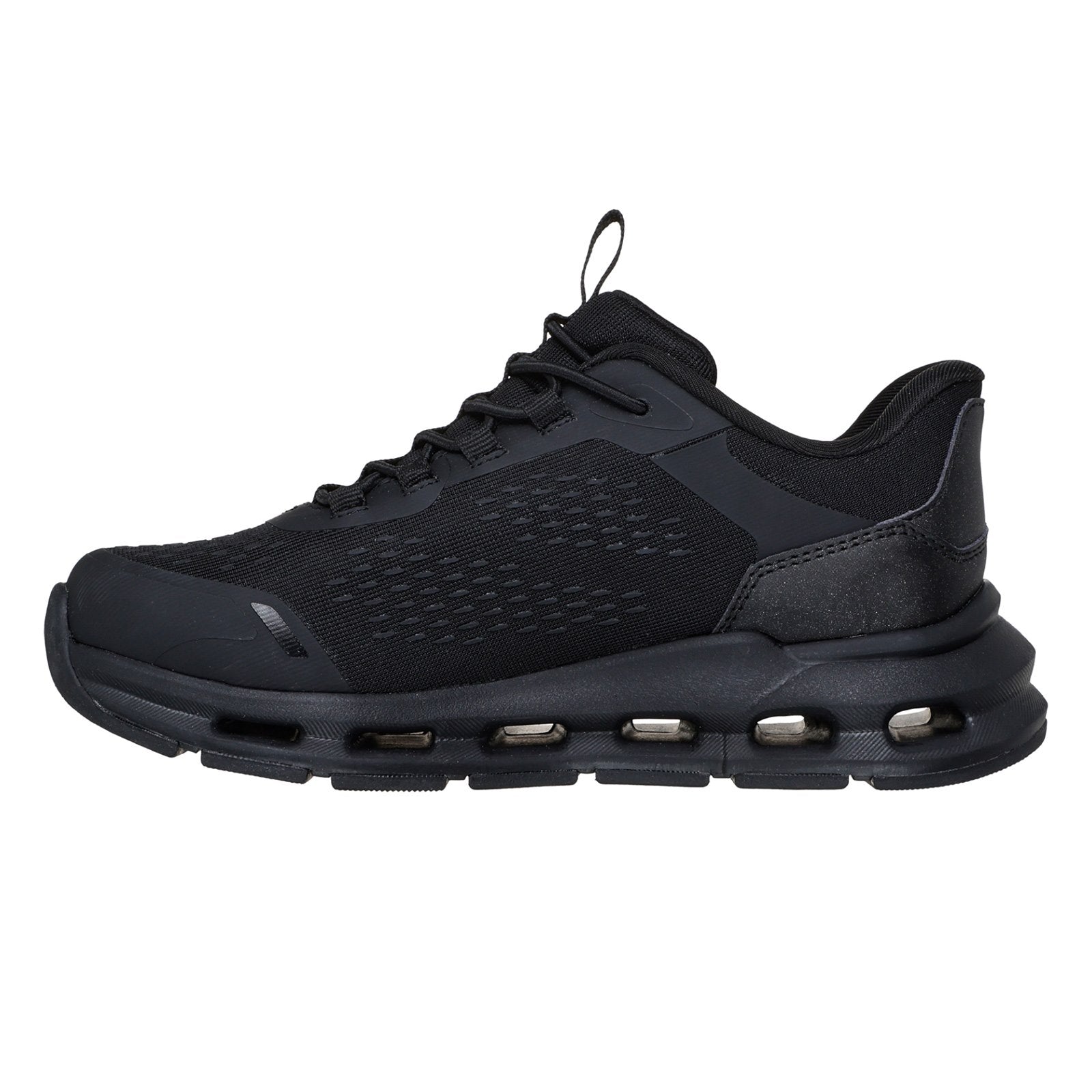 Play all day with added comfort in Skechers Hands Free Slip-ins®: Glide-Step® - Black. Designed with Skechers Heel Pillow®, this sporty slip-on features a mesh and synthetic upper with stretch laces, a cushioned Glide-Step® geometric midsole, and a Skechers Air-Cooled Memory Foam® insole.