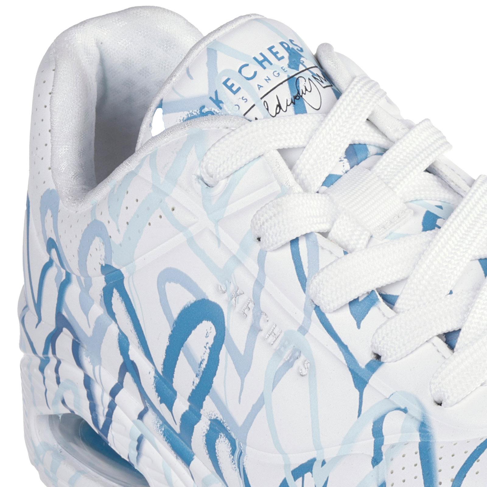 Internationally renowned muralist James Goldcrown brings his iconic #Lovewall heart designs to Skechers in this inspiring collaboration. Show your creative style with the Skechers x JGoldcrown: Skechers Street™ Uno - Spread the Love. This lace-up fashion sneaker features an allover print of the artist's signature heart design that extends to the outsole, synthetic durabuck and perforated trimmed upper with a Skechers Air-Cooled Memory Foam® insole, and a platform wedge with visible Skech-Air® air-cushioned midsole.