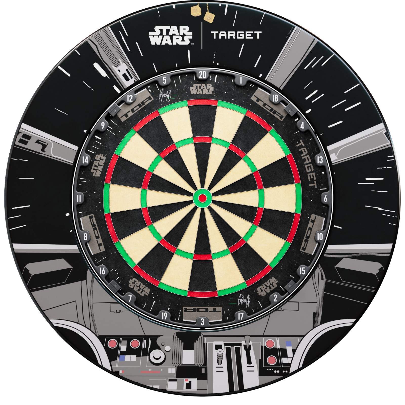 Inspired by the Falcon’s cockpit, the surround frames your board with a cinematic view out into the galaxy, while the TOR dartboard beneath delivers competition-level performance.