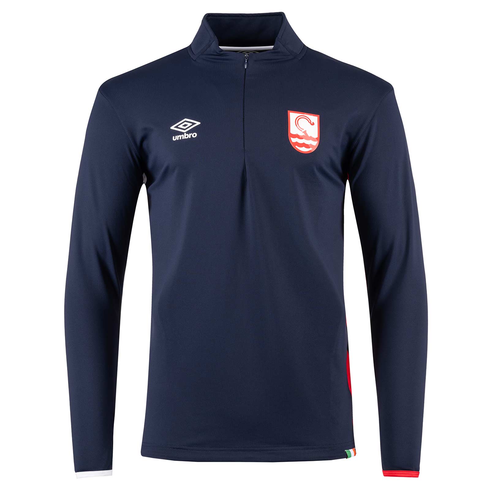 The 1/2 zip features a simple design with the St Patrick's Athletic crest on the chest, making it instantly recognisable to fans. Made from durable material, this top is designed to provide maximum comfort and durability during training or gameplay. The fabric wicks moisture away from the body, keeping you dry and cool even during intense physical activity. Featuring a high neckline and long sleeves, providing a classic and comfortable fit. The Umbro logo is prominently displayed on the right of the chest, while the St Patrick's Athletic FC crest is placed on the left, showing off the team's pride and tradition.